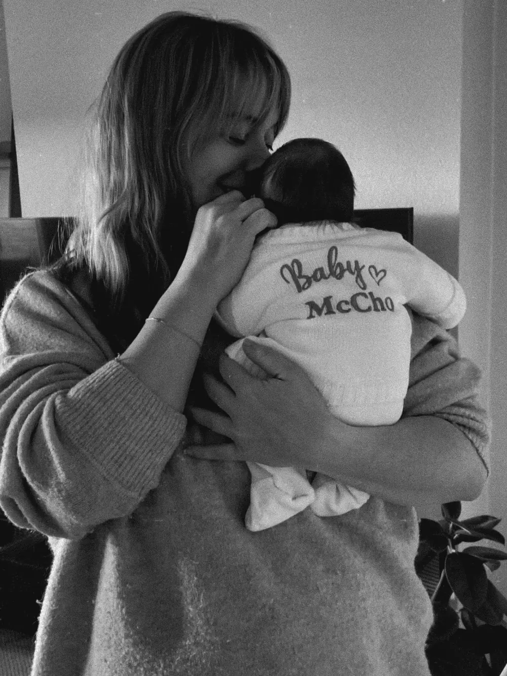 Earlier today (November 13), she finally posted a carousel of photos featuring the newborn—his tiny hands, his first moments at home, and a sweet shot of her husband carrying the baby in a sling as they left the hospital.