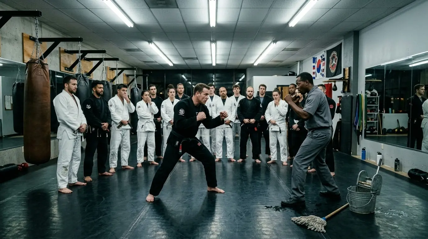 “So, janitor,” Brandon sneered, “how about showing my students how to do a basic guard? Or is that too complicated for someone who only knows how to push a mop?”