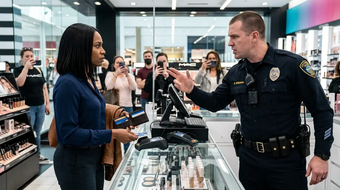 He hesitates. One second. Something about her posture. Too confident. Like she knows her rights. Like she’s not worried.