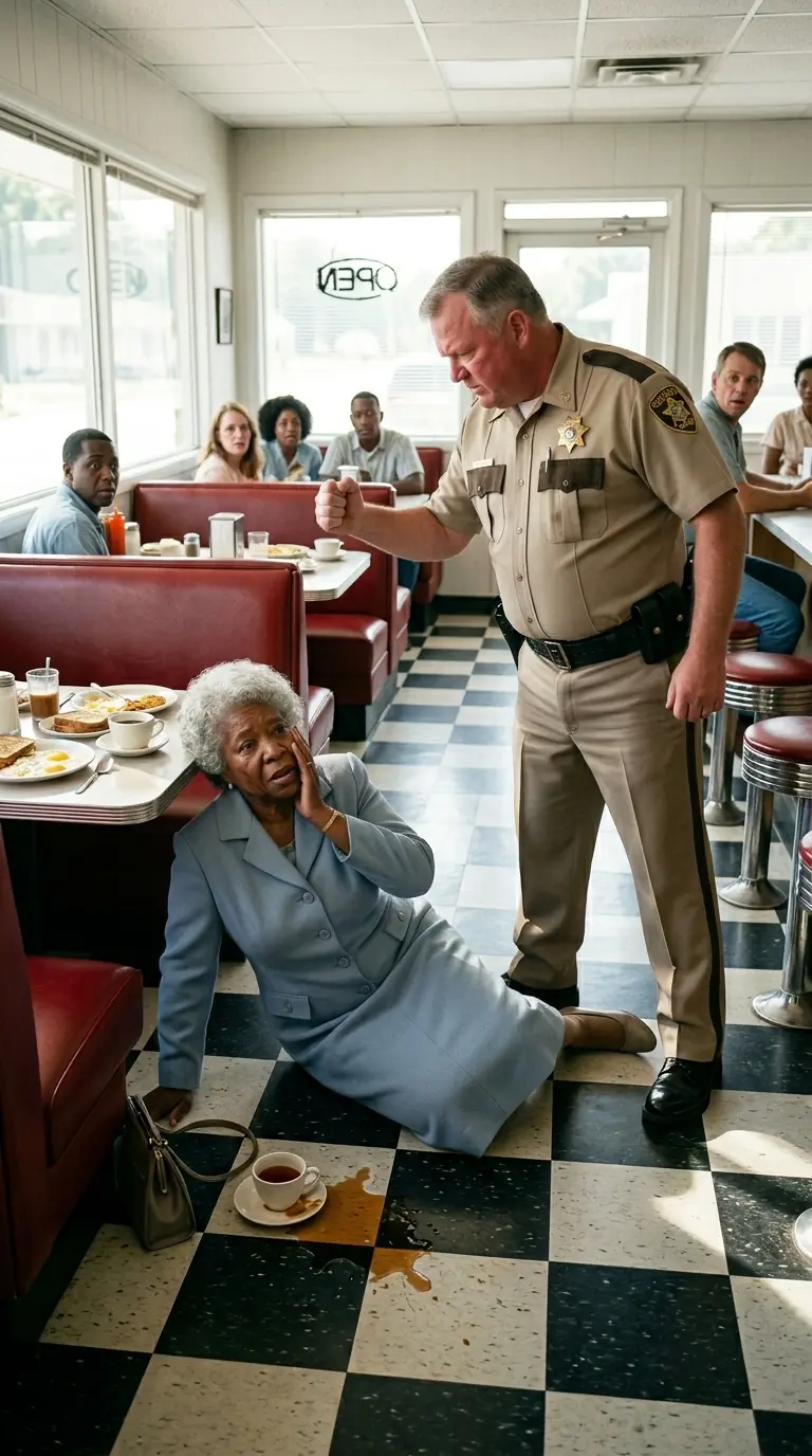 The sound, sharp, brutal, final, reverberated through the diner like a gunshot, freezing every patron mid-motion. Forks hovered above plates of grits and eggs. Coffee cups stopped halfway to lips. The low hum of morning conversation died so completely that the only sound left was the faint drip of liquid hitting tile and the harsh breathing of the sheriff standing over the crumpled woman.