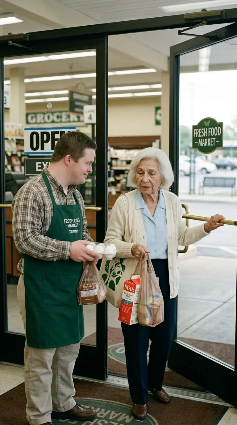 He wore the same blue apron every shift, tied the same way, with the same slightly crooked name tag pinned over his chest. His hands were broad and gentle, and he packed groceries the way some men handle old photographs. Eggs never went under cans. Bread never got crushed beneath detergent. Frozen food stayed together. Soap and vegetables were kept apart. If a carton looked weak, he doubled the bag without being asked. If a customer had arthritic hands, he tied the handles looser.