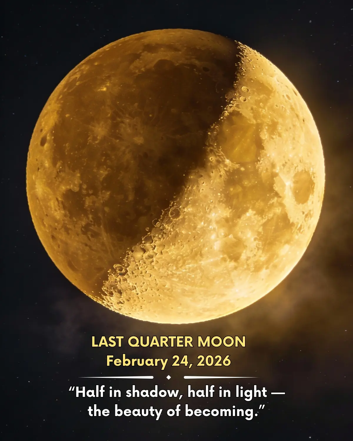 On the quiet early hours of February 24, 2026, the Moon reaches its Last Quarter phase, marking another important step in its monthly journey around Earth. At this stage, half of the Moon’s visible surface is illuminated, while the other half slips back into shadow — creating a striking divide between light and darkness.