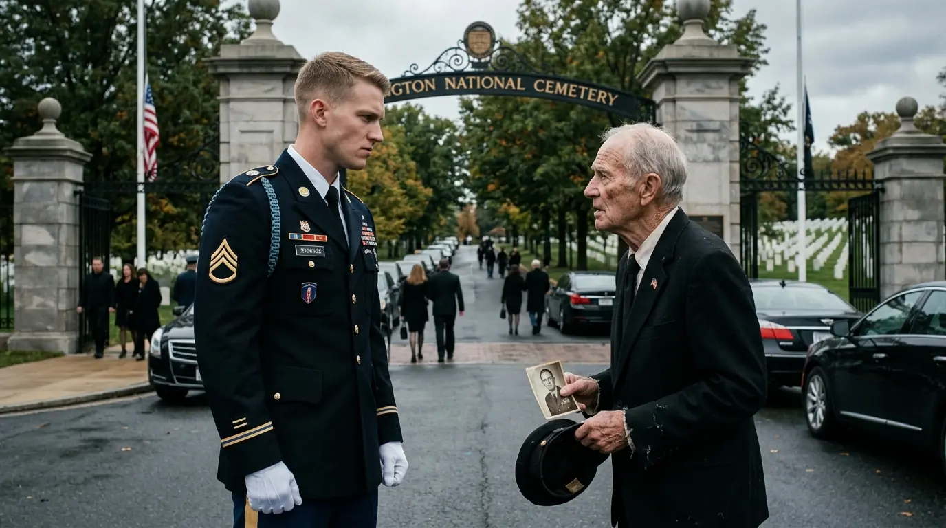 The guard's voice, sharp and laced with disdain, cut through the solemn morning air. He stood with his arms crossed, a human barricade in a crisp dress uniform, blocking the grand entrance to Arlington National Cemetery. His partner, a man of similar youth and arrogance, smirked beside him.