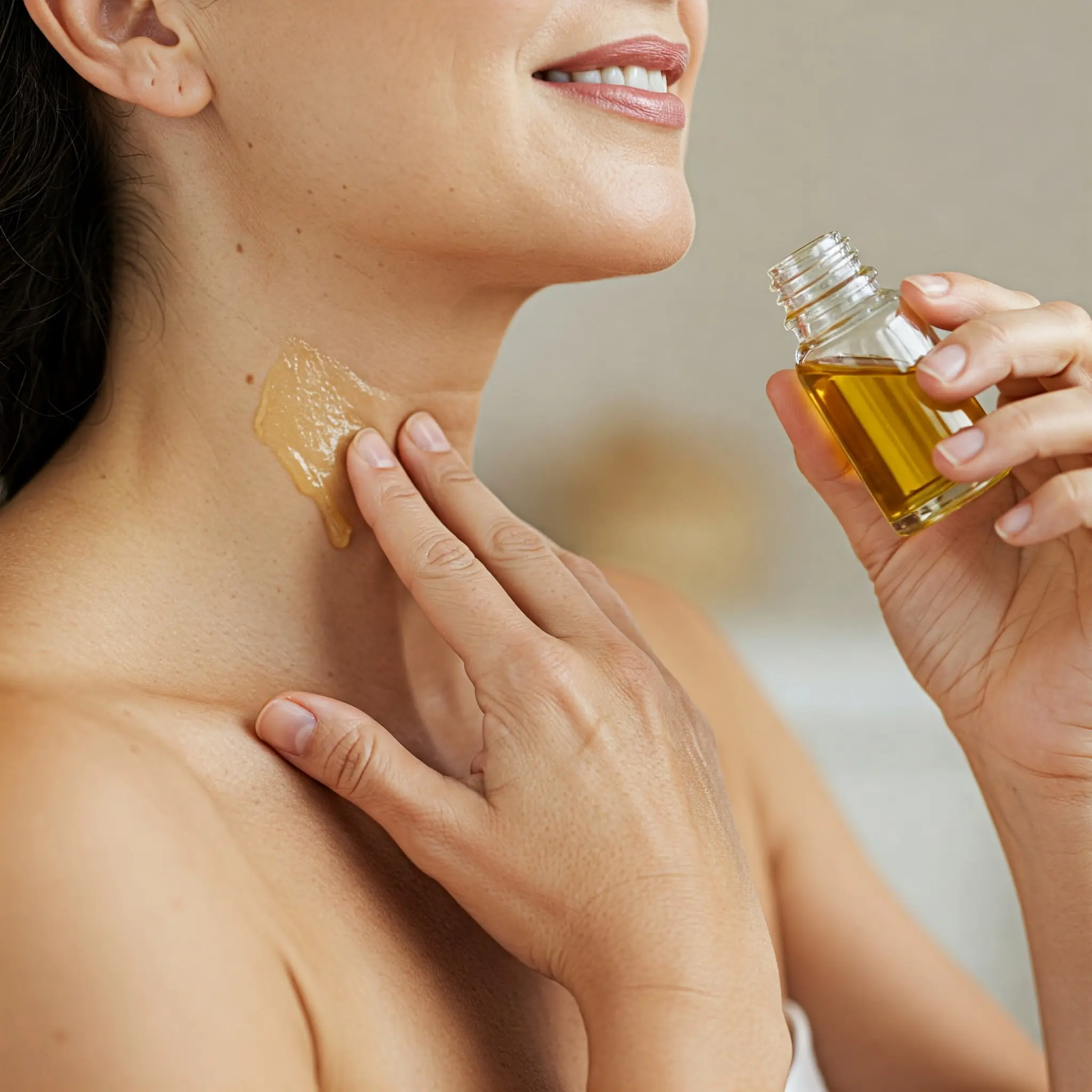 Massage the Neck: Gently massage the warm almond oil into your neck in upward, circular motions. This helps improve circulation and ensures that the oil is absorbed into the skin.