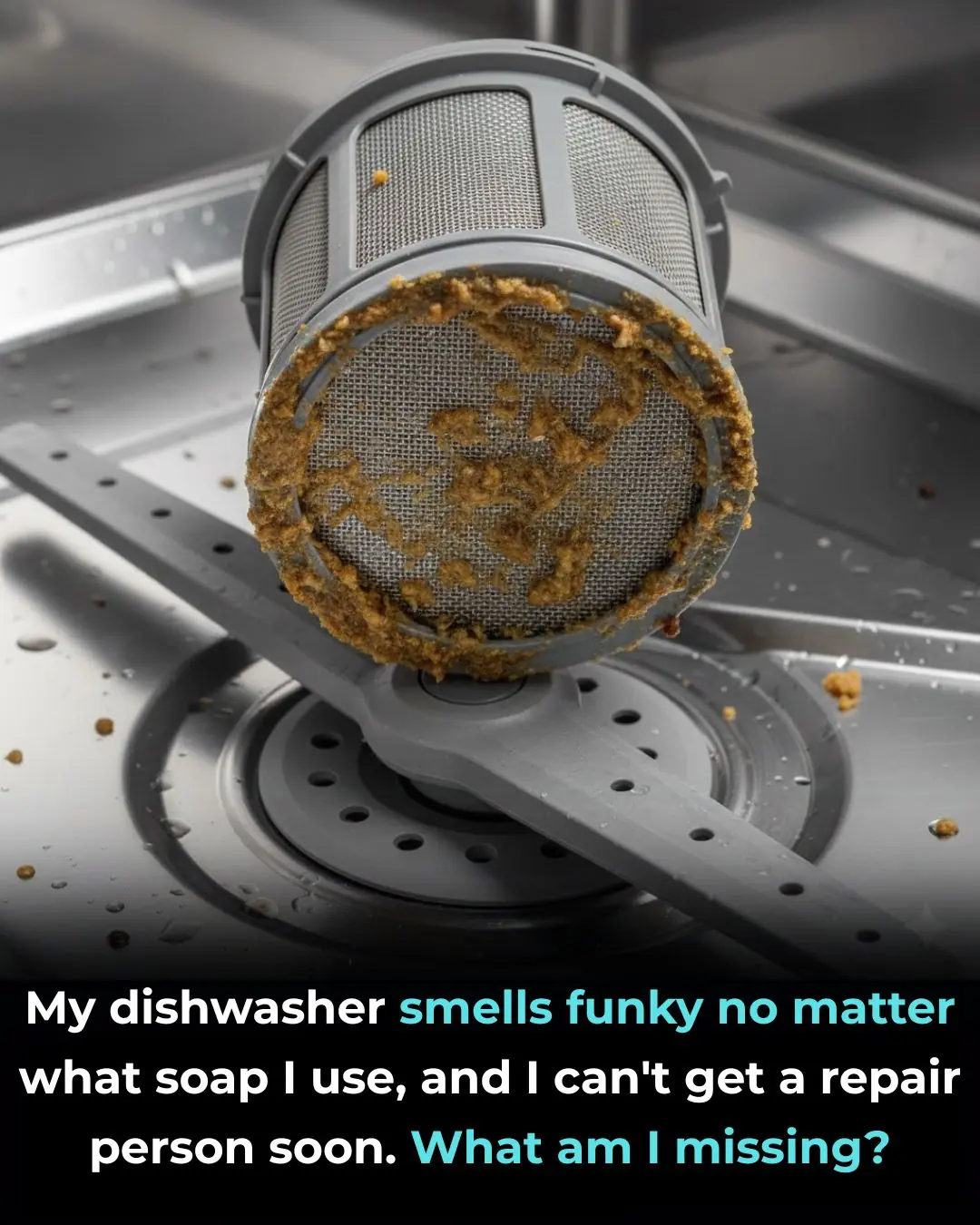 My dishwasher smells funky no matter what soap I use, and I can’t get a repair person soon. What am I missing?