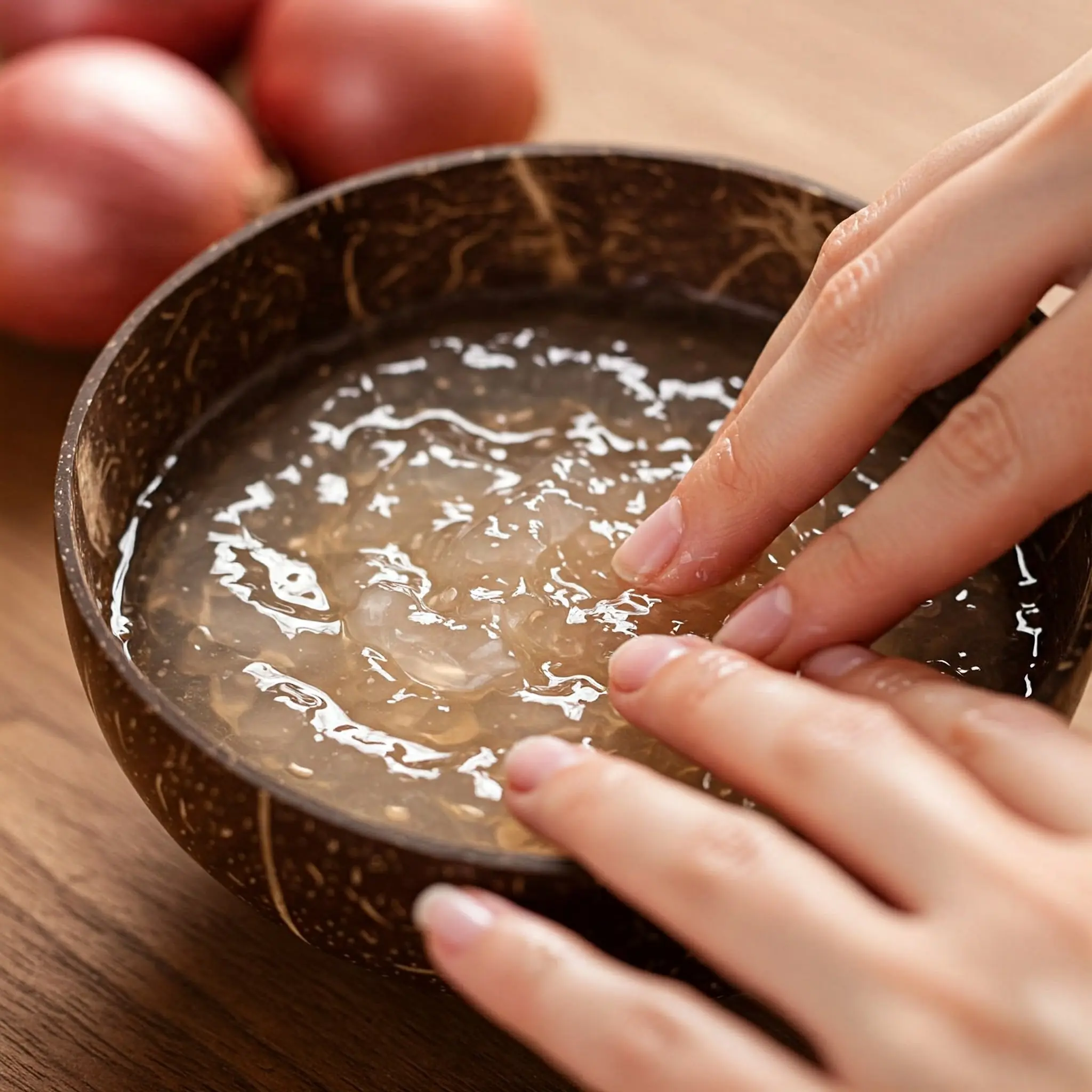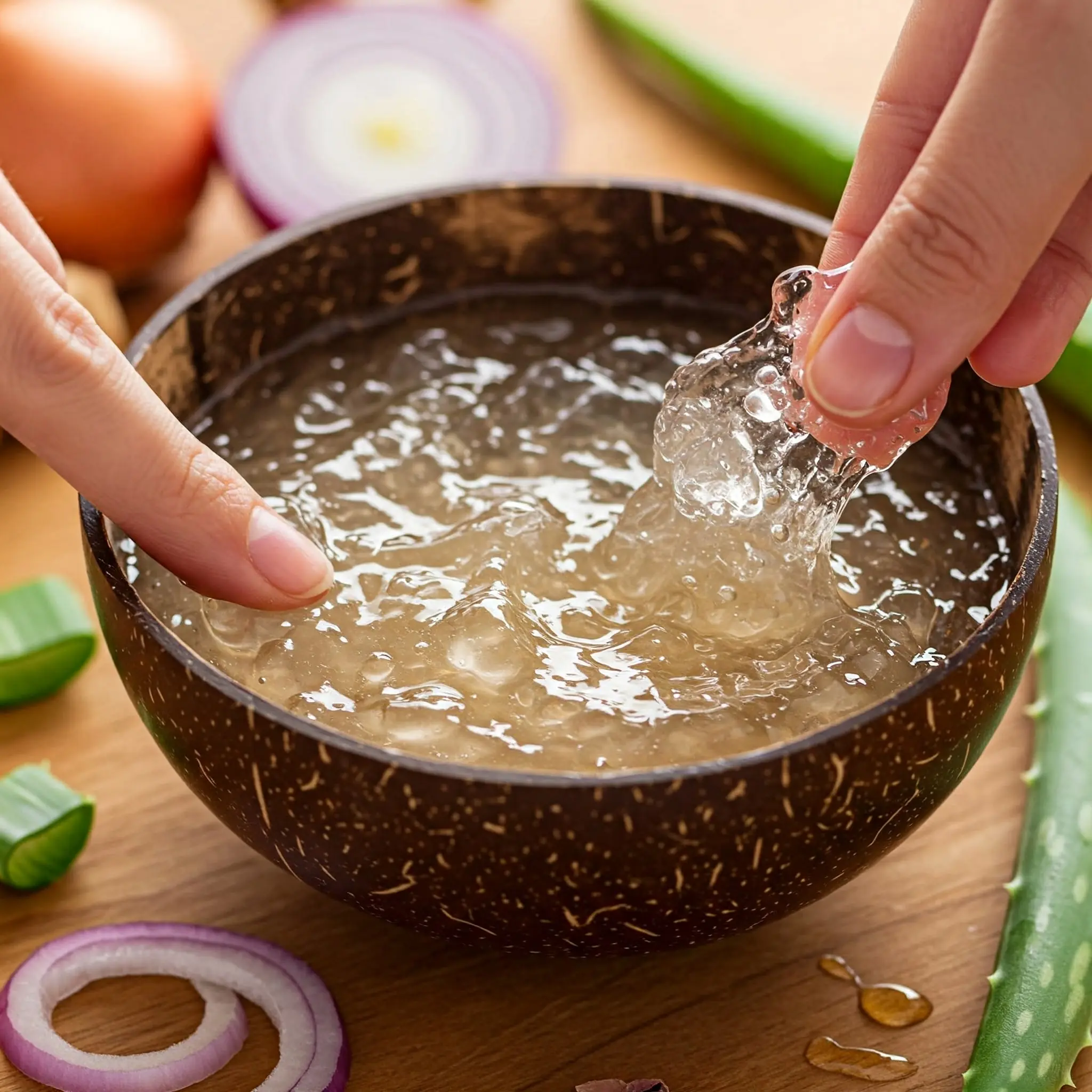 Prepare the Base: In a clean mixing bowl, combine the fresh onion juice with 2 tablespoons of pure aloe vera gel. Stir until the mixture is smooth and well-blended.