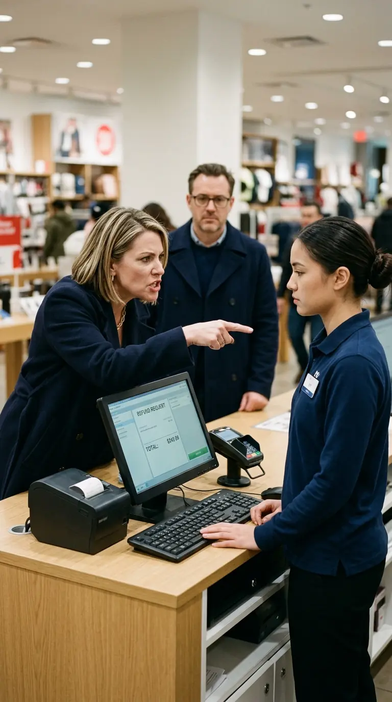 “My package was stolen off my porch,” the woman said, slapping a folded receipt onto the counter. “I want a full refund. And cash, not store credit.”