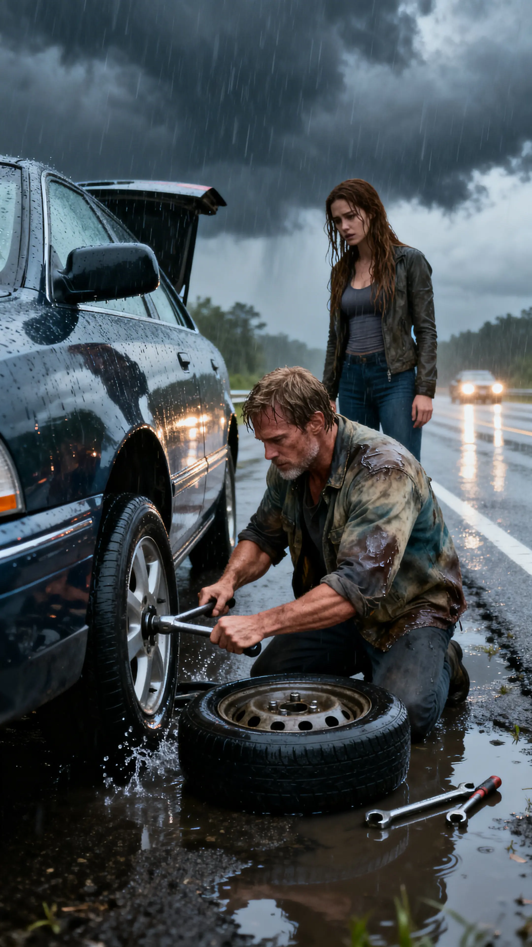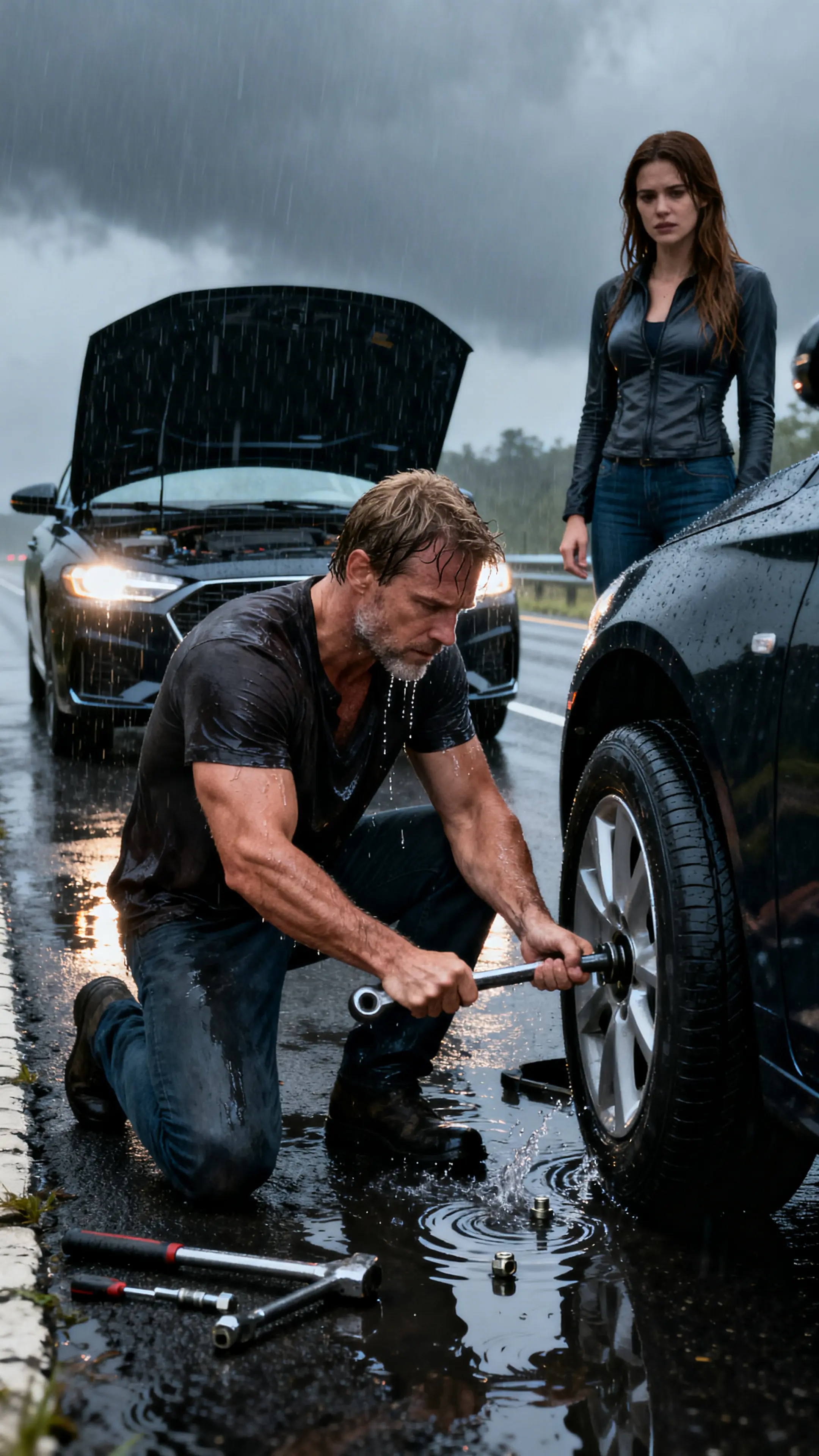 I got to work loosening the lug nuts with the same wrench my dad had taught me to use when I was barely big enough to hold it. My shirt was soaked in seconds, water dripping into my eyes, but muscle memory kept my hands steady.
