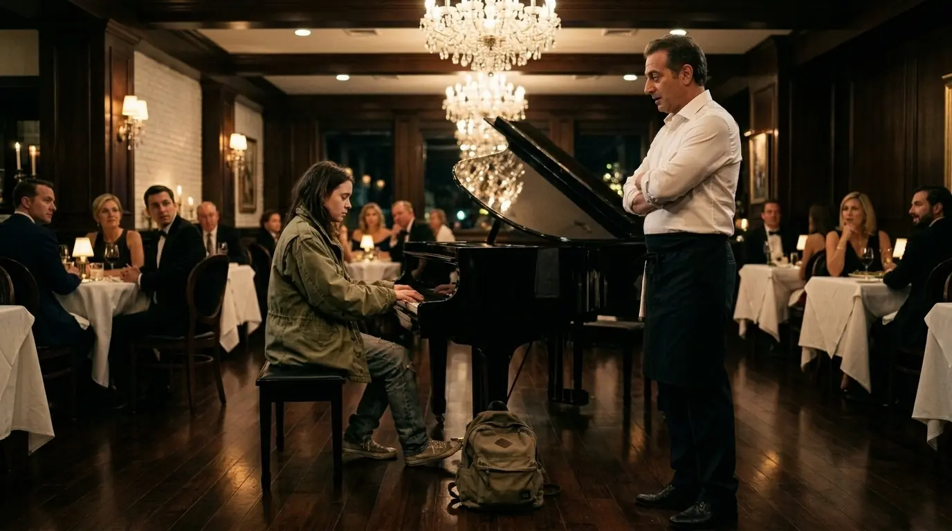 “I know I don’t look like I belong here,” Maya said quickly. Her voice came out softer than she intended. She cleared her throat and tried again. “But I saw your piano, the one in the corner. I can play. I’m actually pretty good. I was wondering if maybe I could play something for you. Just one song. And in exchange, maybe I could have something to eat. Anything, even just bread. I’m not picky.”