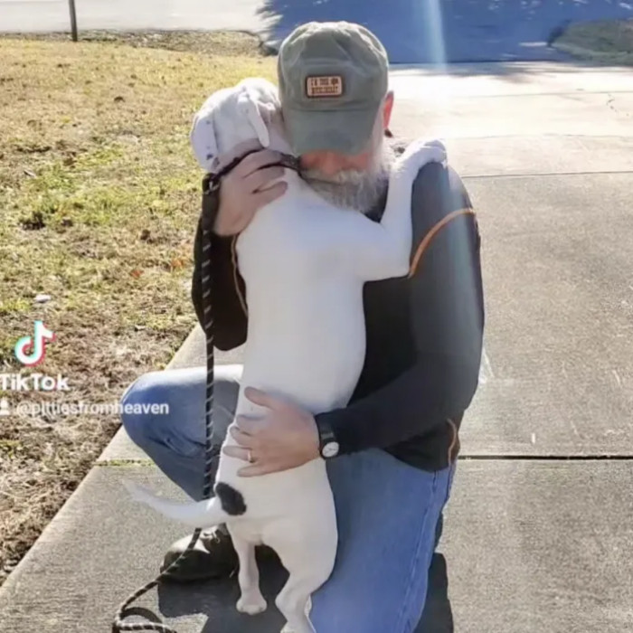 As if she understood the significance of the moment, she walked slowly over to her new dad, stood up on her hind legs, and wrapped her front paws gently but firmly around him in a long, lingering hug.