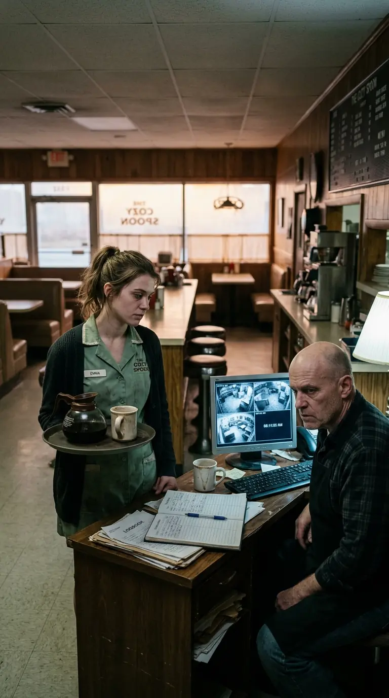 Emma was wiping down tables near the window.