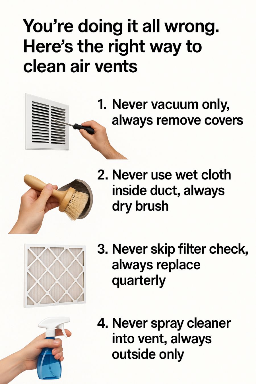 Spraying cleaner directly into vents can introduce moisture and chemicals into your ductwork, potentially damaging your HVAC system and promoting mold growth. Liquid cleaners can also leave residue that attracts more dust and dirt.